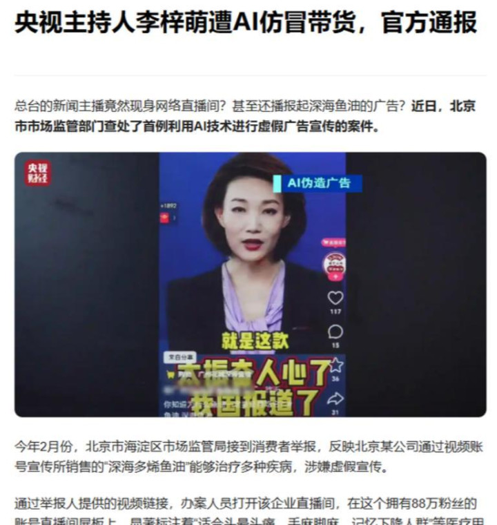 监管部门调查之后发现,涉事主体为一家生物科技有限公司,该公司为提升产品销量,通过第三方技术团队获取了李梓萌的公开视频素材,利用AI换脸及语音合成技术,伪造了一段“李梓萌推荐鱼油”的宣传视频。