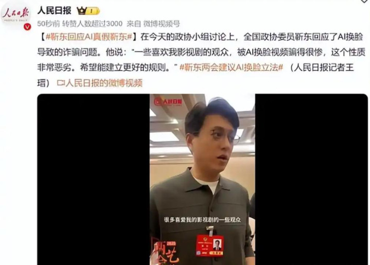 靳东已经在两会上两次强调AI换脸导致的诈骗问题: