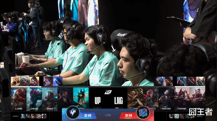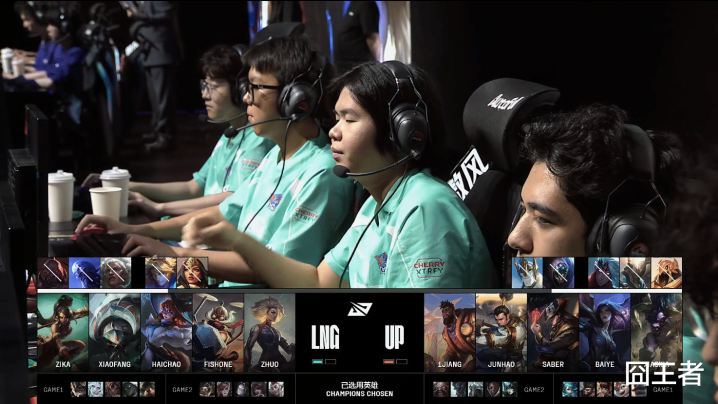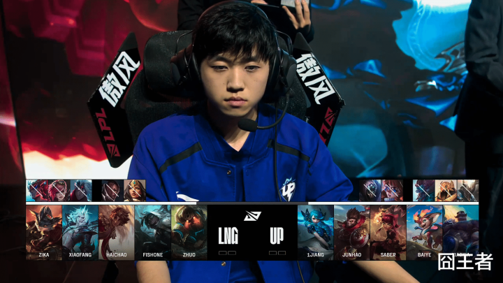 第一局比赛,LNG蓝色方,禁用:永恩、蔚、韦鲁斯、卢锡安、轮子妈,选用:Zika兰博、xiaofang佛耶戈、haichao岩雀、fishone赛娜、Zhuo泰坦;UP红色方,禁用:潘森、沙皇、巨魔、兔子、武器,选用:1Jiang格温、Junhao猴子、Saber安妮、Baiye小火龙、Xiaoxia布隆