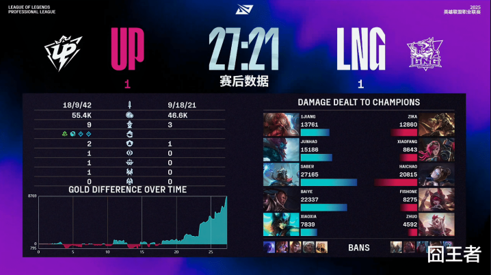 结果第二局比赛,双方在前中期打得十分激烈,到了后期UP突然发力,迅速的掌握了节奏,赢下比赛。11分钟左右:1Jiang被越塔换掉打野,UP拿下小龙和先机;18分钟左右:Baiye卢锡安闪现躲发条大仍被击杀,UP拿下听牌龙和先锋;21分钟左右:Junhao巨魔先锋撞飞发条,随后再杀掉霞;23分钟左右:UP团战完美发挥团灭LNG,随后拿下电龙魂;最终27分21秒:LNG面对电龙魂和大龙无力招架,UP顺利赢下比赛