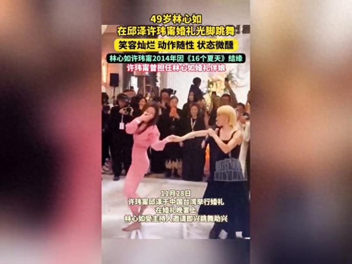 49岁林心如在邱泽许玮甯婚礼光脚跳舞, 笑容灿烂、动作随...