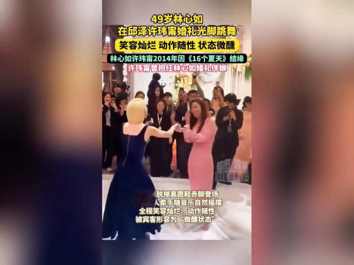 49岁林心如在邱泽许玮宁婚礼光脚跳舞,笑容灿烂,动作随性,状态微醺。