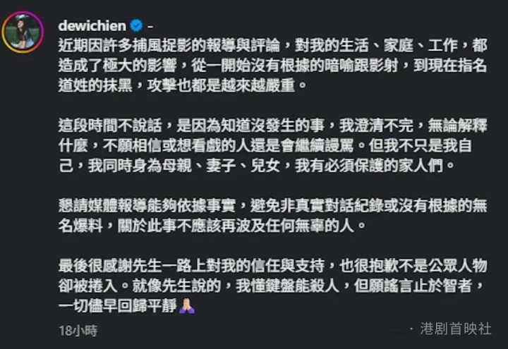 他11月27日突然在Facebook透露,有名红极一时的女星,背负小三骂名多年,如今她女儿也有样学样,当了情妇还堕胎,态度又嚣张,让他斥责:感觉和她妈当年一样。